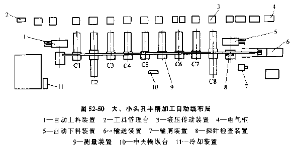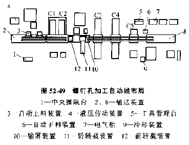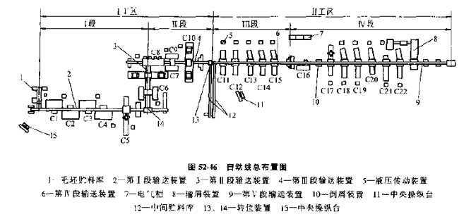 自動線總布局見圖52-48,圖52-49、圖52-50,三條自動線由20臺機床組成,每條自動線都有單獨的自動上下料裝置。