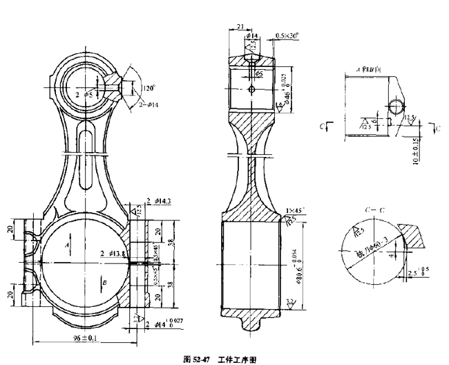 該自動線用于連桿大,小頭孔粗加工,半精加工及螺釘孔加工,加工工件見圖52-47,工件材質為45鋼。