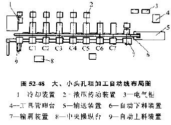 毛坯上線后,先加工出定位面與兩個定位銷孔。在精加工前對定位銷孔再進行一次修整,以保證精加工工序精度。對工件幾個重要部位采用以下加工方法,對導管孔采用鉆、擴、鏜、鉸四道工序,對裝噴油嘴的孔應采用劃定心孔,鉆大孔、劃球窩、鉆小孔、復合擴、復合鉸等工序。為滿足生產率要求和保證孔的直線度,挺桿孔采用槍鉆、槍鉸。自動線的工序安排見表52-19。由于自動線節(jié)拍時間長,一些鉆鉸工位上采用了工位轉塔動力頭以縮短自動線長度。