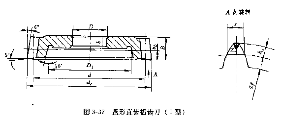 GB6081—85《直齒插齒刀的基本型式和尺寸》中規(guī)定了模數(shù)1~12mm,分度圓壓力角為20°的盤形直齒插齒刀(Ⅰ型)、碗形直齒插齒刀(Ⅱ型)和錐柄直齒插齒刀(Ⅲ型)三種。盤形直齒插齒刀主要用于加工外齒輪和大直徑的內(nèi)齒輪,以及齒條等,其公稱分度圓直徑有75,100,125,160和200mm五種,精度等級(jí)分AA、A、B三種,盤形直齒插齒刀的型式和尺寸見圖3-37和表3-72~表3-77、表3-85~表3-90。