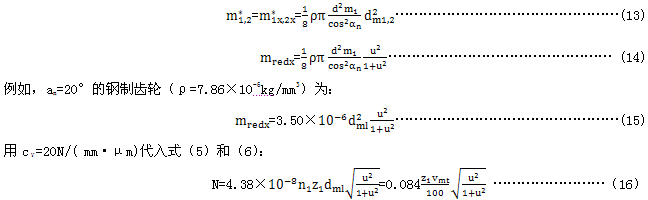 對(duì)圓柱齒輪,采用co′=14N/( mm·μm)。對(duì)圓柱斜齒輪的研究表明,螺旋 角增加時(shí),齒的剛度降低。另一方面,錐齒輪的輪齒在錐體上的螺旋形布置加強(qiáng)了斜齒、弧齒錐齒輪的剛度。由于缺乏更深入的了解,在平均條件下(FmtKA/bc≥100N/mm,與bc/b≥0.85),圓柱直齒輪的剛度對(duì)錐齒輪是適用的。因此,c′能按下式確定: