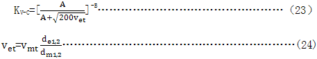由曲線6~9與精密齒輪傳動(dòng)(7.7.4.2)選擇KV-C 是基于傳動(dòng)誤差(見7.4)基礎(chǔ)之上的。如果不能獲得傳動(dòng)誤差,則評(píng)價(jià)齒面上的接觸斑點(diǎn)也是合理的。如果每側(cè)齒面的接觸斑點(diǎn)不一致,則齒距精度(齒距偏差)作為精度的代表數(shù)值,以確定動(dòng)載系數(shù)。C是精度等級(jí)系數(shù),按GB/T10095.1給出的計(jì)算式計(jì)算。