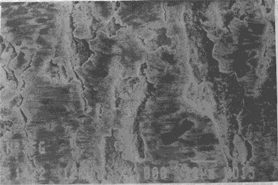 油膜相對(duì)于重載很薄的潤(rùn)滑條件下運(yùn)轉(zhuǎn)的齒輪副工作齒面的損傷。損傷面放大后可見密密麻麻成片的微小蝕微小裂紋。
