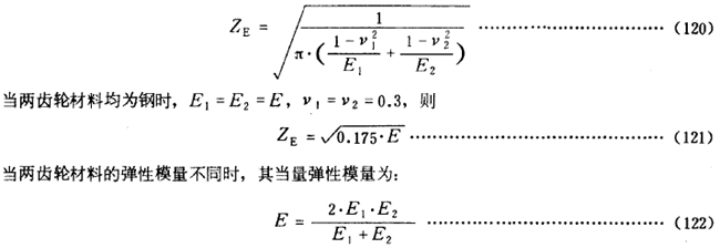 彈性系數(shù)ZE是用以考慮材料彈性模量E泊桑比v對(duì)赫茲應(yīng)力的影響。其數(shù)值可按實(shí)際的材料彈性模量E和泊桑比v由式(120)計(jì)算得出。對(duì)于某些常用材料組合的ZE可參考表14查取。