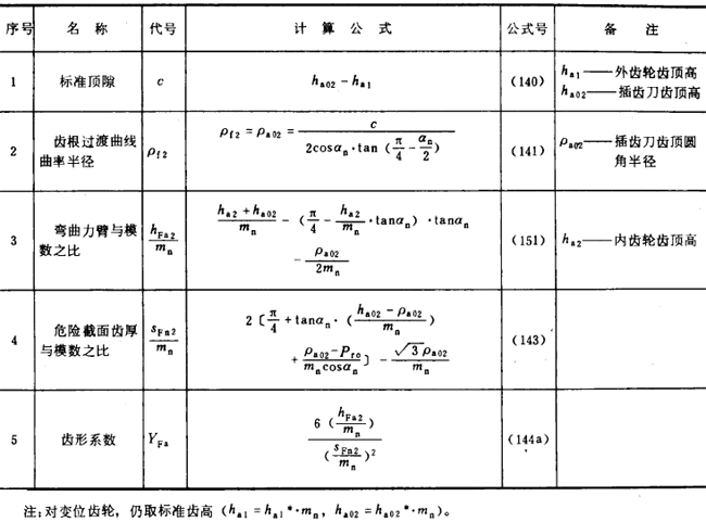 內(nèi)齒輪的齒形系數(shù)YF不僅與齒數(shù)和變位系數(shù)有關(guān),且與插齒刀的參數(shù)有關(guān)。為了簡化計(jì)算,可近似按替代齒條計(jì)算(見圖27)。替代齒條的法向齒廓與基本齒條相假,齒高與內(nèi)齒輪相同,法向載荷作用角αFen等于αn,并以腳標(biāo)2表示內(nèi)齒輪。有關(guān)計(jì)算公式見表16(適用于Z2>70)。