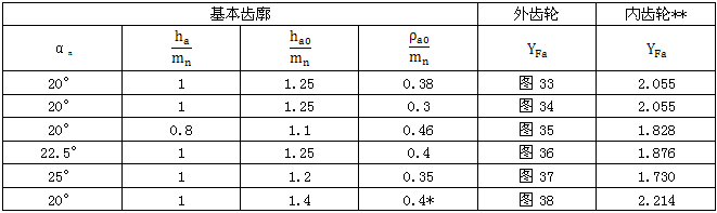 與圖33至38各齒形參數(shù)相對(duì)應(yīng)的內(nèi)齒輪齒形系數(shù)YFa也可由表19查取。