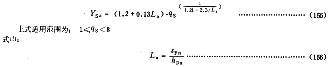 對(duì)于齒形角αn為20°的齒傳輸線,YSa可按式(155)計(jì)算。對(duì)于其他齒形角的齒輪,可按此式近似計(jì)算YSa。