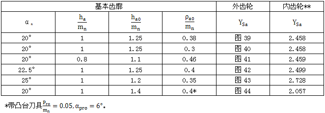 與圖39至44各齒形參數(shù)相應(yīng)的內(nèi)齒輪應(yīng)力修正系YSa也可由表20查取。