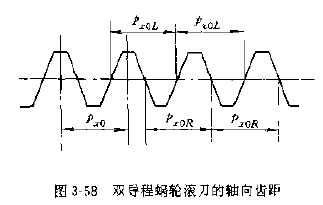 雙導程蝸輪滾刀有三種齒距;理論齒距pxo左側(cè)面齒距pxol和右側(cè)齒面齒距pxor,見圖3-58。滾刀全長上各個刀齒的齒厚由一端向另一端逐漸增大,其中有一個刀齒的齒厚等于標準值,稱此刀齒為標準齒,通過標準齒中線的截面,稱為標準截面見圖3-59。標準齒和標準截面是制造滾刀時控制齒厚的依據(jù),也是加工蝸輪時的對刀基準。