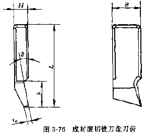 成對滾切銑刀盤切齒時,兩把銑刀盤在工件的同一齒槽內工作,一把切削左齒面,另一把切削右齒面,切齒時有展成運動,銑刀盤工作側刃與銑刀端面之間通常作出一個角,使產(chǎn)形輪的齒面成為一個凹錐面,因此切出的齒輪齒長方向呈中鼓形,有利于嚙合,根據(jù)使用機床的不同,銑刀盤的直徑有150。270及600mm,其中以直徑為600mm的銑刀盤應用最廣。刀齒的凹入角δ有1°30′、2°30′和5°三種,常用的成對滾切銑刀盤刀齒的尺寸見圖3-76和表3-149~表3-151。