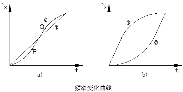 如a中的②圖所示,在頻率輸出過程中,頻率與時間的關系呈“S”形,即:在剛起動時,頻率的變化比較慢(0-P段),然后頻率又和時間成線性變化,在Q點以后,頻率的變化又降了下來。此種方式適合于帶式輸送機一類的負載。