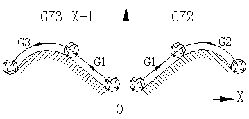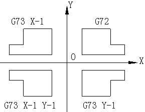 在數(shù)控加工程序代碼中,有個(gè)鏡像加工的指令。比如某型號(hào)加工中心的鏡像加工指令為G73(示意圖如圖1所示),其中設(shè)原加工圖形為第一象限的G72,使用G73 X-1指令后就可以加工出第二象限所示的圖形。也就是說(shuō)將原程序段的加工代碼按Y軸或X軸(或XY混合)做軸向鏡像,當(dāng)要加工鏡像體時(shí)不需要另外編制程序,只需要將原程序代碼加以鏡像即可。