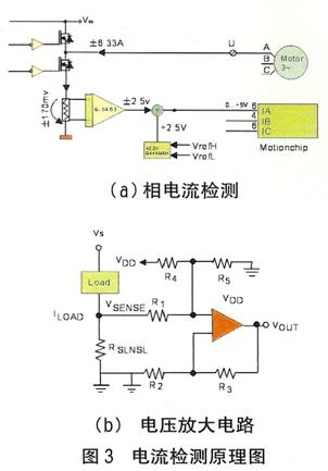 電流檢測(cè) 電機(jī)電流檢測(cè)電路可提供重要的反饋信息,將該信息與來自主控DSP的控制信號(hào)相結(jié)合,可以控制MOSFET或IGBT的柵極驅(qū)動(dòng)芯片并最終調(diào)整電機(jī)速度。如果要實(shí)現(xiàn)過流保護(hù),還必需進(jìn)行電流監(jiān)控,不過對(duì)于低端應(yīng)用而言,傳統(tǒng)的過流保護(hù)卻顯得過于昂貴。電流采樣的方案是在逆變橋的下橋臂串一0.027Ω采樣電阻如圖3(a),采樣電流范圍為0~6.22A,采樣后的電壓放大倍數(shù)為14.63倍,放大電路如圖3(b),并經(jīng)2.5V電壓抬升輸入DSP,所以輸入DSP的電流模擬電壓量為: UAD=2.5+I×0.027×14.63。 MotionChip AD口的模擬量輸入電壓為0~5V,所以電流采樣經(jīng)量化的值為: