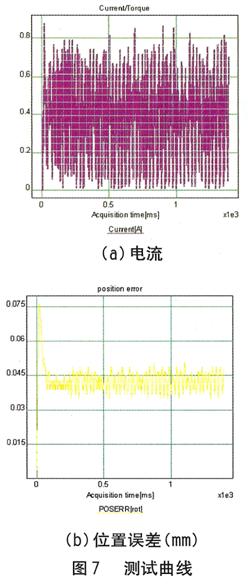 用戶操作界面功能有: •參數(shù)設(shè)置與顯示模塊主要是設(shè)置一些系統(tǒng)參數(shù)(如掃查長(zhǎng)度,探測(cè)寬度)和控制參數(shù)(如速度參數(shù)、加速度參數(shù)等); •任何時(shí)刻,控制程序都時(shí)刻監(jiān)視系統(tǒng)的運(yùn)行狀況,隨時(shí)對(duì)系統(tǒng)故障做出相應(yīng)的處理。 軟件部分包括X向運(yùn)動(dòng)和Y向的掃查運(yùn)動(dòng),數(shù)據(jù)存儲(chǔ)及處理,手動(dòng)控制,故障處理,運(yùn)動(dòng)狀態(tài)顯示及故障顯示等。操作界面(GUI)給予清晰、簡(jiǎn)單的用戶界面,方便用戶調(diào)試、運(yùn)行,同時(shí)能夠?qū)⑺欧?qū)動(dòng)器傳遞過來的信息顯示出來,便于監(jiān)控。任務(wù)編程模塊將要實(shí)現(xiàn)控制任務(wù)的規(guī)劃,如X軸向和Y軸向運(yùn)動(dòng)等,包括故障查詢、處理。 運(yùn)行效果 智能伺服驅(qū)動(dòng)器性能的好壞直接決定整個(gè)系統(tǒng)設(shè)計(jì)的成敗,為此用一直流電機(jī)對(duì)驅(qū)動(dòng)器進(jìn)行測(cè)試,電機(jī)的電流和位置誤差如圖7(a)、(b)所示,從圖7中可以看出,驅(qū)動(dòng)器的響應(yīng)時(shí)間只有0.12s,位置誤差很小。通過對(duì)通訊速度及上位機(jī)控制命令的測(cè)試顯示,在實(shí)時(shí)性要求不是非常嚴(yán)格的情況下,以RS232串口或者485串口的通訊速率是完全可以滿足系統(tǒng)需求的。