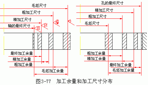 加工總余量也是個變動值,其值及公差一般可從有關手冊中查得或憑經驗確定。如圖 3-77 表示了內孔和外圓表面經多次加工時,加工總余量、工序余量與加工尺寸的分布圖。
