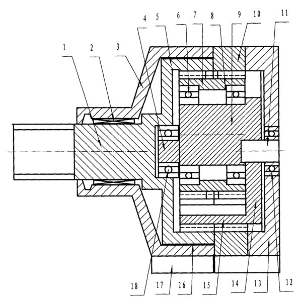 一種減速機包括外殼、齒輪、輸出軸,其特征在于:電動機壓蓋與環(huán)形內齒輪、外殼、固定底座固定連接,壓蓋外側中心有動力輸入軸承,由平衡體圓軸、圓弧狀平衡塊、平衡體底板組成的平衡體,平衡體底板上有與圓弧狀平衡塊同心的動力輸入軸孔,平衡體圓軸另一端有與動力輸入軸孔同心的平衡塊凸軸,平衡體圓軸上用軸承安裝著雙聯齒輪,雙聯齒輪的右齒輪與環(huán)形內齒輪嚙合,與輸出軸一體的輸出內齒輪與雙聯齒輪之左輪相嚙合,安裝在外殼內,輸出內齒輪與外殼間裝有聚四氟滑動軸承,輸出內齒輪側壁中心孔內裝有平衡體凸軸和凸軸軸承,輸出軸與外殼間裝有輸出軸承。