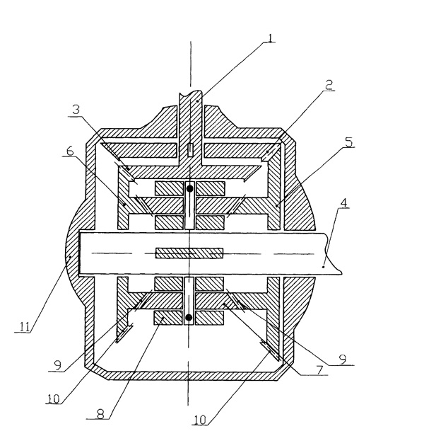 | 本發(fā)明涉及機械傳動裝置,具體地說是以非等速運動的速度差完成力的傳遞,并具有大傳動比的速差減速機。速差減速機設(shè)有相互垂直設(shè)置的主動軸(1)和從動軸(4)、第1主動錐齒(2)和第2主動錐齒(3),從動軸(4)上滑動套大雙錐齒滑動齒輪(5)和小雙錐齒滑動齒輪(6),大雙錐齒滑動齒輪(5)和小雙錐齒滑動的內(nèi)齒圈(9)之間設(shè)有行星齒輪(7)同時與兩側(cè)內(nèi)齒圈(9)嚙合,所述行星齒輪輪輻(8)與從動軸(4)傳動連接。由于兩個雙錐齒滑動齒輪因不同徑而產(chǎn)生速度差,因而行星齒輪(7)同時受兩個雙錐齒滑動齒輪異向驅(qū)動力和速差平衡驅(qū)動力的作用。通過調(diào)節(jié)兩個雙錐齒滑動齒輪的直徑差,就可以得到所需的傳動比,傳動比可達數(shù)千至數(shù)萬。另外速差減速機的結(jié)構(gòu)非常簡潔、緊湊,因此,體積相對較小。 |