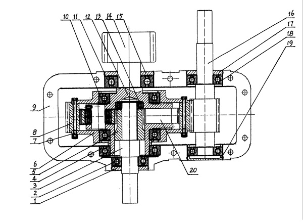 | 一種絞車差動(dòng)減速機(jī),由電機(jī)輸入軸、太陽輪軸、太陽輪、齒圈、行星輪、行星架、行星端蓋、外齒輪、箱體、軸承和油封組成,其特征在于:在箱體(9)上通過軸承(18)安裝電機(jī)輸入軸(16),通過軸承(2)安裝太陽輪軸(3),通過軸承(4)(11)安裝行星架(12),在行星架(12)上通過軸承(13)安裝太陽輪軸(3),通過軸承(10)安裝行星端蓋(6),齒圈(8)通過螺栓(7)安裝在行星端蓋(6)上,電機(jī)輸入軸(16)上的齒輪與齒圈(8)嚙合,行星輪(20)與齒圈(8)的內(nèi)齒輪和太陽輪(5)嚙合,行星輪(20)與行星架(12)相連。 |