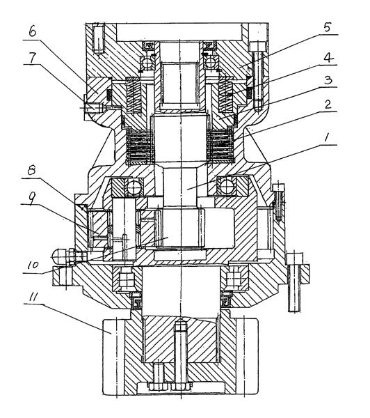 本實用新型提供的回轉減速機,在殼體內(nèi)有常閉摩擦制動機構和行星減速機構,殼體包括馬達座[5]、油缸體、摩擦片座、行星輪架軸承座和內(nèi)齒殼體[8]等部分,其中油缸體、摩擦片座和行星輪架軸承座三部分為一件零件[6]。本實用新型提供的回轉減速機,在滿足軸線加工要求的前提下將殼體上多個部分設計成一個零件,降低了安裝難度,減少了密封件的使用,提高了安裝牢固性、提高了防油料滲漏性能,另外還免去了被連成一體的零件中原先各部分端面的加工工序?梢,本實用新型提供的回轉減速機,節(jié)約了加工成本和裝配成本,提高了使用性能。