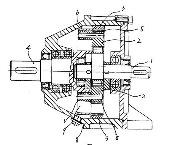 | 一種行星齒輪減速機(jī),包括機(jī)座[8]、設(shè)置在所述的機(jī)座[8]上的輸入軸[1]和輸出軸[4]以及內(nèi)齒輪[3]、設(shè)置在所述的輸入軸[1]上的行星齒輪[2]、柱銷(xiāo)[5]、套在所述的柱銷(xiāo)[5]上的柱銷(xiāo)套[6],所述的行星齒輪[2]與內(nèi)齒輪[3]相嚙合,其特征在于:所述的柱銷(xiāo)[5]與行星齒輪[2]相固定連接,所述的輸出軸[4]上開(kāi)有滾道孔[9],所述的柱銷(xiāo)套[6]插在所述的滾道孔[9]內(nèi)。 |