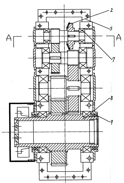 | 一種高油位自潤(rùn)滑減速機(jī),它有多級(jí)齒輪傳動(dòng),其特征在于,在高位的第一級(jí)傳動(dòng)中采用相互垂直的錐齒輪與錐齒軸嚙合傳動(dòng),錐齒軸的另一端為輸入端,在錐齒軸的輸入端及末級(jí)傳動(dòng)的輸出軸出軸處均采用雙油封密封,上述第一級(jí)傳動(dòng)直接浸泡在潤(rùn)滑油中,實(shí)現(xiàn)濺油潤(rùn)滑方式。 |