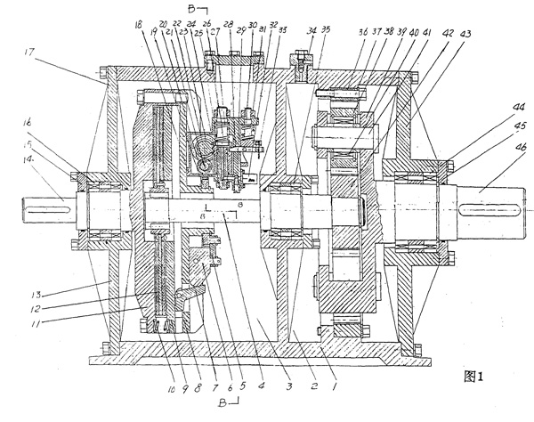 | 一種軟啟動減速機(jī),在其機(jī)殼(1)及端蓋的軸承座中裝有輸入軸(14)、輸出軸(46)、其間裝有減速齒輪組,其特征在于: 輸入軸(14)連接一組摩擦片離合器,該離合器主要由裝在軸壓盤(11)與壓爪盤(8)之間的壓盤(9)和摩擦片組(12)構(gòu)成,該軸壓盤(11)、壓盤(9)及壓爪盤(8)以螺釘(17)連接為一體,該壓盤(9)與軸壓盤(11)之間裝有分離彈簧(10);該摩擦片組(12)至少包括兩片外片(121)及夾持于外片之間的內(nèi)片(122),該內(nèi)片中心固接一花鍵套(123); 在摩擦片離合器與減速齒輪組之間以一花鍵軸(4)連接,該花鍵軸(4)的花鍵端連接花鍵套(123),另端以鍵連接齒輪(42),其中部由機(jī)體(1)的中間軸承座(35)支承;在摩擦片離合器的壓爪盤(8)的外側(cè)面上裝有軟啟動器(3),其構(gòu)造為:在壓爪盤(8)上鉸接有等分圓周的至少二組壓爪(7),該壓爪的內(nèi)臂(701)接觸壓盤(9),該壓爪(7)的外臂(702)接觸離心塊(6)的頂端,該離心塊(6)裝在壓爪盤(8)的徑向滑槽(801)中,該離心塊(6)鉸接于連桿(5),該連桿(5)傾斜鉸接調(diào)速齒輪(19),該調(diào)速齒輪(19)固裝在壓爪盤(8)的空心軸套(802)上;該調(diào)速齒輪(19)連接時間調(diào)節(jié)器(18); 至少二組時間調(diào)節(jié)器(18),其數(shù)量與壓爪(7)的數(shù)量相同,各安裝在軟啟動器(3)相鄰兩壓爪(7)之間的壓爪盤(8)上,每一時間調(diào)節(jié)器(18)的構(gòu)造為:在時間調(diào)節(jié)器外殼(48)中平行地安裝有螺桿式軸齒輪(21)和軸齒輪(22),該螺桿式軸齒輪(21)螺接套裝有一內(nèi)螺紋式齒條(20)而可軸向移動,該內(nèi)螺紋式齒條(20)與調(diào)速齒輪(19)嚙合,該螺桿式軸齒輪(21)與軸齒輪(22)的同軸齒輪(23)嚙合,該軸齒輪(22)與齒條式空氣缸(24)的齒條嚙合,該齒條式空氣缸(24)的內(nèi)螺紋端與導(dǎo)向桿(26)的外螺紋端涂密封膠螺接,該導(dǎo)向桿(26)外圓套裝彈簧(27),該齒條式空氣缸(24)內(nèi)孔中裝有柱塞(25),該柱塞(25)另端固定于機(jī)殼(1),該齒條式空氣缸(24)徑向移動與套裝于其內(nèi)部的柱塞(25)之間形成氣室,該氣室經(jīng)柱塞(25)、節(jié)流閥(29)、空氣過濾器(32)與外界空氣相通;該柱塞(25)上端受套裝在導(dǎo)向桿(26)外圓上的彈簧的壓力,該齒條式空氣缸(24)側(cè)面插入開鎖銷(28)的頭部,該開鎖銷(28)中部以銷軸(47)鉸接于開鎖銷(28),其尾 |