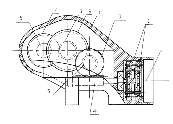 | 本實用新型提供的是一種緊湊型大減速比減速機(jī)。它包括殼體和安裝在殼體內(nèi)的減速機(jī)構(gòu),所述的減速機(jī)構(gòu)包括行星齒輪機(jī)構(gòu)、蝸輪蝸桿機(jī)構(gòu)和齒輪機(jī)構(gòu),行星齒輪機(jī)構(gòu)的輸出軸與蝸桿同軸,蝸輪與蝸桿相配合,蝸輪上安裝有同軸齒輪、且該齒輪與大齒輪相嚙合,與大齒輪同軸的齒輪與輸出軸上固定的齒輪嚙合。本實用新型通過行星齒輪機(jī)構(gòu)、蝸輪蝸桿機(jī)構(gòu)和齒輪機(jī)構(gòu)相互配合,達(dá)到減速目的,通過這種組合,達(dá)到較大的減速比,使減速機(jī)的整體體積小,結(jié)構(gòu)緊湊、簡單,從而降低制作成本,且使減速機(jī)的安裝使用更方便。 |
