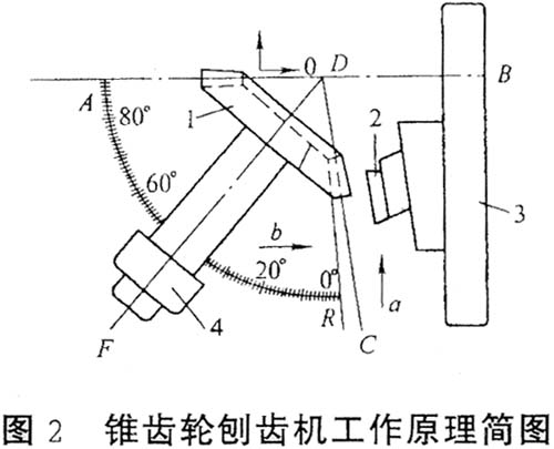 裝在機(jī)床搖臺3的滑枕上的刨齒刀2,除了可以按a向移動以外,還可以繞搖臺軸線OB轉(zhuǎn)動。齒坯一方面繞OF轉(zhuǎn)動,同時按箭頭b方向移動,使它的節(jié)錐中心O和機(jī)床中心D重合后即可進(jìn)行加工。