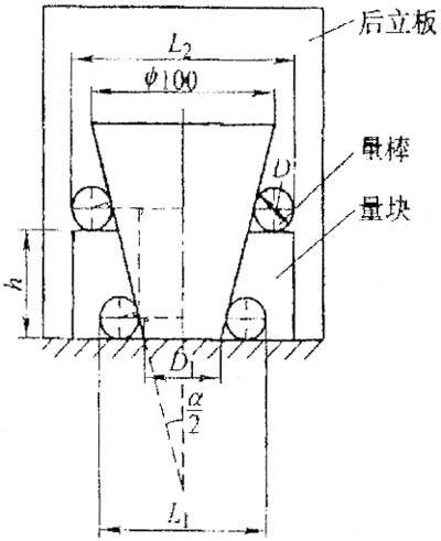 。2)將兩只量棒拿開,用兩塊高h(yuǎn)=60mm的長方體量塊放在平臺上,且上端內(nèi)側(cè)與被測錐軸緊貼,后端面頂住后立板。將兩只量棒分別放在兩量塊的大方,且內(nèi)側(cè)與被測圓錐軸緊貼,后端頂住后立板,測出L2=163.19mm。則所測錐軸的錐度為: