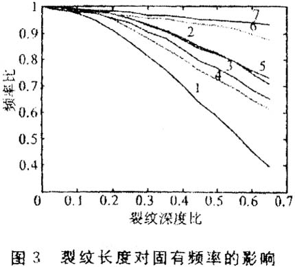 為進(jìn)一步研究裂紋對構(gòu)件動力學(xué)特性的影響,本文對齒輪齒根裂紋作了更深入的仿真,仿真過程主要針對不同裂紋深度的齒輪展開(深度從小到大,共仿真了14組數(shù)據(jù)),對各齒輪均提取了其前10階固有頻率值。各階固有頻率隨裂紋深度變化的趨勢圖如圖3所示,其中橫坐標(biāo)代表裂紋深度比(裂紋深度和齒根處齒厚之比);縱坐標(biāo)為裂紋齒輪和正常齒輪的固有頻率比。為便于觀察,本文僅畫出了前7階固有頻率隨裂紋深度變化的趨勢圖,如圖3所示。