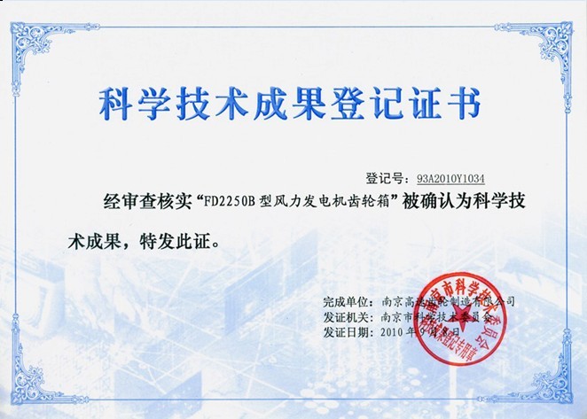 2010年8月26日,在南京高速齒輪制造有限公司(以下簡稱:高速公司)400畝廠區(qū),召開了“ FD1775B、FD2250B型風(fēng)力發(fā)電機(jī)齒輪箱”科技成果鑒定會(huì)。會(huì)議邀請(qǐng)了南京理工大學(xué)、南京航空航天大學(xué)、東南大學(xué)、南京市江寧區(qū)科技局等單位的專家、領(lǐng)導(dǎo)組成了鑒定委員會(huì)。鑒定委員會(huì)聽取了高速公司的項(xiàng)目研制工作總結(jié)等報(bào)告,審查了相關(guān)技術(shù)文件,考察了生產(chǎn)現(xiàn)場。最終一致認(rèn)為高速公司研制的兩項(xiàng)產(chǎn)品總體技術(shù)水平達(dá)到了國際同類產(chǎn)品先進(jìn)水平,同意通過科技成果鑒定,并希望進(jìn)一步擴(kuò)大國內(nèi)外市場。