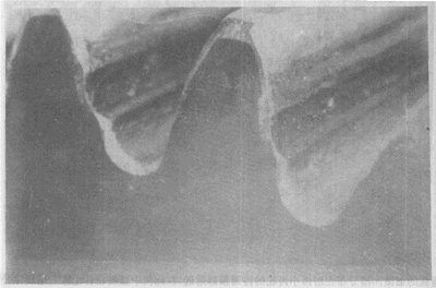 有時(shí),由于過(guò)載或過(guò)載和疲勞綜合作用引起的裂紋,其剩余的未開裂的材料在裂紋方向可能因剪切作用而最終折斷。這種斷齒的剪切區(qū)通常呈球狀或圓形隆起狀(隆起剪切區(qū)),該剪切區(qū)沿?cái)嗝孀罱咏诜枪ぷ鼾X面的那一邊延伸。