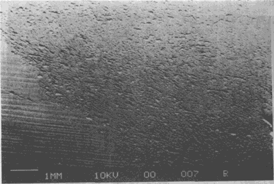 油膜相對(duì)于重載很薄的潤(rùn)滑條件下運(yùn)轉(zhuǎn)的齒輪副工作齒面的損傷。損傷面放大后可見密密麻麻成片的微小蝕微小裂紋。
