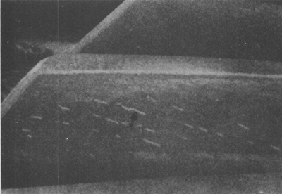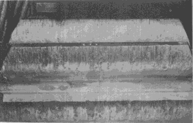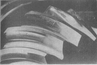 高速運(yùn)轉(zhuǎn)齒輪齒面頂部的沖蝕,其部位與潤(rùn)滑劑噴嘴的方向一致。
