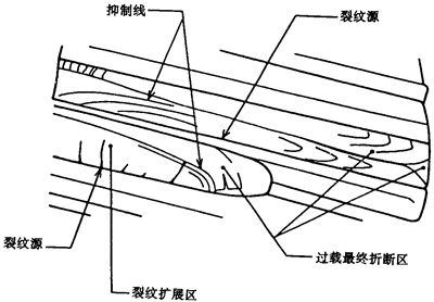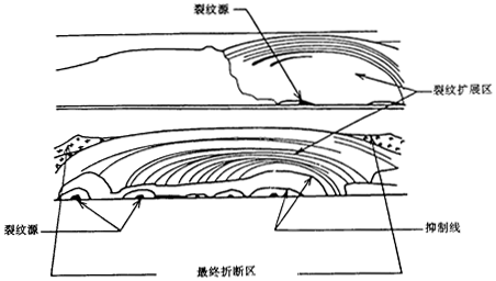 斷口面分為兩個(gè)不同的區(qū)域,疲勞斷口面和最終斷口面。在疲勞區(qū)內(nèi)看不到塑性變形痕跡,斷口面平滑、無(wú)光澤,有時(shí)由于被抑制線分割,可顯現(xiàn)出裂紋擴(kuò)展各連續(xù)階段的間隔區(qū)。