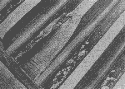 可看到的細(xì)微溝槽分布在磨齒小齒輪的齒面頂部附近。在此例中擦痕在各輪上呈規(guī)律分布,也見2.1.1中圖