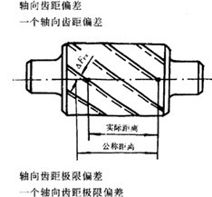 在有效齒寬范圍內(nèi),與齒輪基準(zhǔn)軸線平行面大約通過凸齒或凹齒中部的一條直線上,任一軸向齒距內(nèi),兩個(gè)同側(cè)齒面間的實(shí)際距離與公稱距離之差。沿齒面法線方向計(jì)值。 |