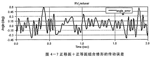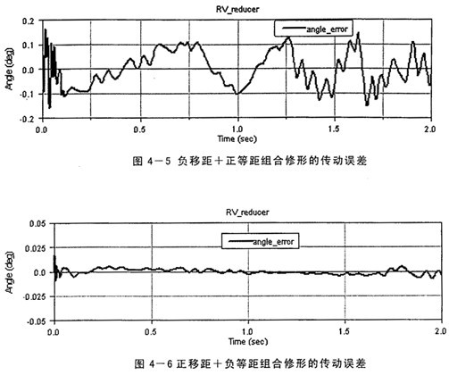其中,θer一一角度運動誤差,一一任意時刻輸入軸轉(zhuǎn)角,i一一傳動比,θout一一輸出軸轉(zhuǎn)角。由于加工誤差、輪齒修形的原因引起瞬時傳動比的變化,必然出現(xiàn)傳動誤差,產(chǎn)生運動的不平穩(wěn)性。在RV減速器中,漸開線齒輪嚙合在前級,后級是擺線針輪傳動,由于后級的傳動比一般約是前級的4~30倍,前級的漸開線齒輪的傳動誤差將被縮小同樣的倍數(shù)后輸出,所以其傳動誤差關(guān)鍵取決于后級的擺線針輪的嚙合誤差,而實際工作中擺線輪的修形方式及修形量的選擇是影響擺線針輪的嚙合誤差很大的因素。因此本課題中僅研究了輪齒修形對傳動誤差的影響,所采用的修形量以及得到的傳動誤差大小如表4-1所示,限于篇幅,對于負(fù)移距+正等距、正移距+負(fù)等距和正移距+正等距組合修形的傳動誤差仿真結(jié)果曲線各只列出一組(圖4-5、4-6、4-7)。