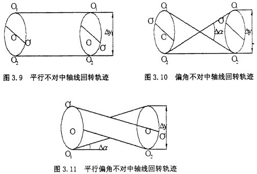 聯(lián)軸器連接的兩轉(zhuǎn)子軸線之間發(fā)生不對中故障時具有平行位移或角度位移,在運動傳遞過程中,聯(lián)軸器中間齒套的運動必須同時滿足兩半聯(lián)軸器的需要,即中間齒套軸線作平面運動,且軸心線的回轉(zhuǎn)運動頻率與轉(zhuǎn)子的運行頻率不一致。當產(chǎn)生平行不對中、偏角不對中和平行偏角不對中三種情況時,聯(lián)軸器中間齒套的軸線回轉(zhuǎn)軌跡分別為圖下圖所示的圓柱體、雙錐體和半雙錐體。在這些圖中,O1,O2為兩半聯(lián)軸器的軸心,O,O′為聯(lián)軸器中間套齒的靜態(tài)和動態(tài)回轉(zhuǎn)中心,△y,△a分別為轉(zhuǎn)子系統(tǒng)的平行和偏角不對中量。