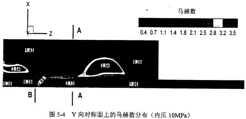 圖5-4給出了XZ對稱面上的馬赫數(shù)分布。管道中的流動在裂尖出口處達到超聲速,而在對稱面附近發(fā)生了強烈的回流。標(biāo)示為B的位置壓力和密度發(fā)生了強間斷,意味著出現(xiàn)了激波。