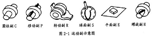 在等角速萬(wàn)向聯(lián)軸器中,大部分都屬于連桿機(jī)構(gòu).最古老的雙聯(lián)十字軸萬(wàn)向聯(lián)軸器機(jī)構(gòu)就是球面四連桿機(jī)構(gòu)。從大量的不同的機(jī)構(gòu)綜合中,有可能得出多種實(shí)用的等角速連桿機(jī)構(gòu),所以研究等角速理論,以連桿機(jī)構(gòu)的型式和尺度關(guān)系為對(duì)象,進(jìn)行新的等角速理論的探索,在一定的意義上是可行的。在機(jī)構(gòu)學(xué)上,構(gòu)件同構(gòu)件間的連接稱為副,其不同的形式和代號(hào)如圖2-1所示: