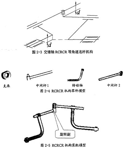 通過(guò)上述的方法,可以得到相交軸、交錯(cuò)軸形式的多種等角速連桿機(jī)構(gòu)。在圖2-2中列出了其中的一部分,它們都是相交軸傳動(dòng)的形式,當(dāng)然全都是鏡面機(jī)構(gòu)。在這些機(jī)構(gòu)中有的已被應(yīng)用在等角速聯(lián)軸器上,如球鉸柱塞式萬(wàn)向聯(lián)軸器就是以RPSPR機(jī)構(gòu)為基礎(chǔ)。在圖2-3中列出了其中的一種較重要的交錯(cuò)軸形式的等角速連桿機(jī)構(gòu)。