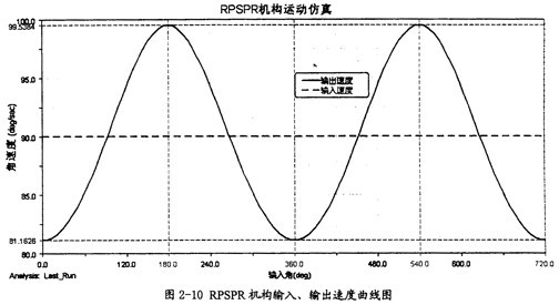 在此仿真中共輸出了此模型運(yùn)動(dòng)兩周的曲線,這證明此模型中雙曲柄肯定存在,按前面的理論,如果機(jī)構(gòu)是鏡面機(jī)構(gòu),在輸入轉(zhuǎn)速恒定的情況下,則輸出轉(zhuǎn)速就是恒定的,在圖2-10中,在輸入轉(zhuǎn)速恒定為90°/s時(shí),其輸出轉(zhuǎn)速是周期變化的。后來(lái)經(jīng)模型修改,將原模型改為完全對(duì)稱結(jié)構(gòu),滿足鏡面機(jī)構(gòu)的條件,重新進(jìn)行仿真,得出的結(jié)果是輸入轉(zhuǎn)速同輸出轉(zhuǎn)速完全相等。這從正反兩面說(shuō)明了前面理論的正確性,同時(shí)也說(shuō)明要想得到等角速傳動(dòng)并不是一件簡(jiǎn)單的事。不過(guò)本次證明只是對(duì)一種形式機(jī)構(gòu)而言,有關(guān)其它的機(jī)構(gòu)形式,還需要進(jìn)一步的探索。