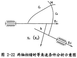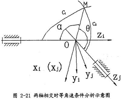 a.兩軸相交時(shí),兩軸交點(diǎn)與嚙合點(diǎn)恒位于兩軸線所成夾角的平分面上,可實(shí)現(xiàn)萬(wàn)向聯(lián)軸器等角速轉(zhuǎn)動(dòng)(又稱同步);