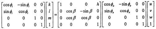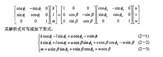 十字軸萬(wàn)向聯(lián)軸器的機(jī)構(gòu)實(shí)際上是球面四連桿機(jī)構(gòu),它的空間運(yùn)動(dòng)關(guān)系早已解析出。當(dāng)輸入、輸出兩軸線的夾角為β輸入軸轉(zhuǎn)角ф