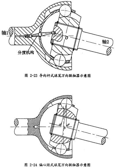 球籠式萬(wàn)向聯(lián)軸器是目前性能最優(yōu)良,應(yīng)用最廣泛的一種等角速萬(wàn)向聯(lián)軸器,根據(jù)結(jié)構(gòu)形式的不同可分為兩大類(lèi),即導(dǎo)向桿式球籠萬(wàn)向聯(lián)軸器和偏心距式球籠萬(wàn)向聯(lián)軸器,分別如圖2-23和圖2-24所示。
