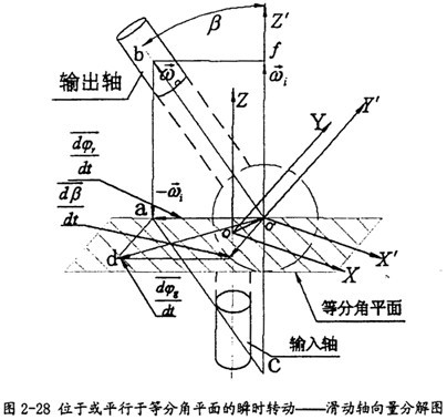 如圖2-28所示,輸入軸與輸出軸通過(guò)一個(gè)萬(wàn)向聯(lián)軸器J聯(lián)接,兩軸夾角β為變量,輸出軸相對(duì)于輸入軸存在瞬時(shí)轉(zhuǎn)動(dòng)——滑動(dòng)軸,用矢量