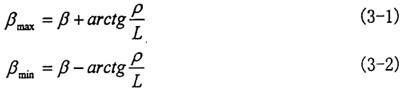由于在轉(zhuǎn)動的過程中,三叉桿交點(diǎn)作旋轉(zhuǎn)運(yùn)動,因此會導(dǎo)致輸入軸與輸出軸之間的夾角發(fā)生變化,其變化范圍為βmin~βmax,當(dāng)O點(diǎn)(見圖3-5)處于輸入軸與輸出軸轉(zhuǎn)動錐中心線所構(gòu)成平面的兩個極限位置時,偏轉(zhuǎn)角達(dá)到兩極值:
