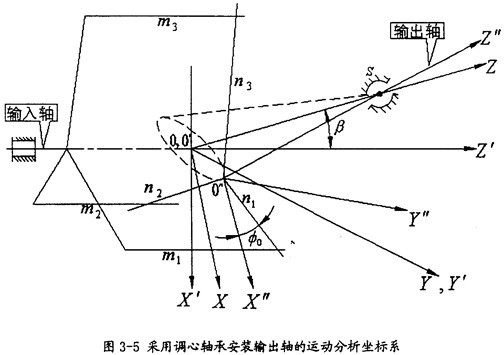 由于輸出軸作一圓錐運(yùn)動,在分析的過程中需建立三套坐標(biāo)系,如圖3-5所示。