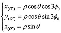 ≈o,cosθ≈1(實際上p<<L,近似處理是合理的),則可得到三小桿的球面中心P在固定坐標(biāo)系o′X′Y′Z′中的運(yùn)動軌跡: